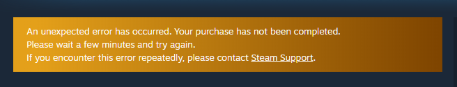 “An unexpected error has occurred. Your purchase has not been completed. Please wait a few minutes and try again. If you encounter this error repeatedly, please contact Steam Support.”